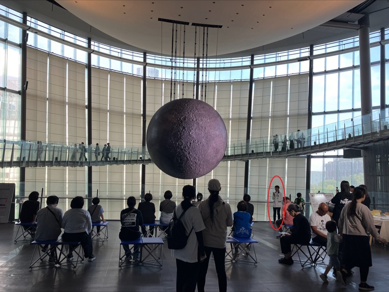 昨年、中秋の名月のころ、未来館ではシンボル展示「ジオ・コスモス」に月を映し出し、その前で私たち科学コミュニケーターが、月の地形や地球との関係、これまでとこれからの探査計画についてトークを行いました。